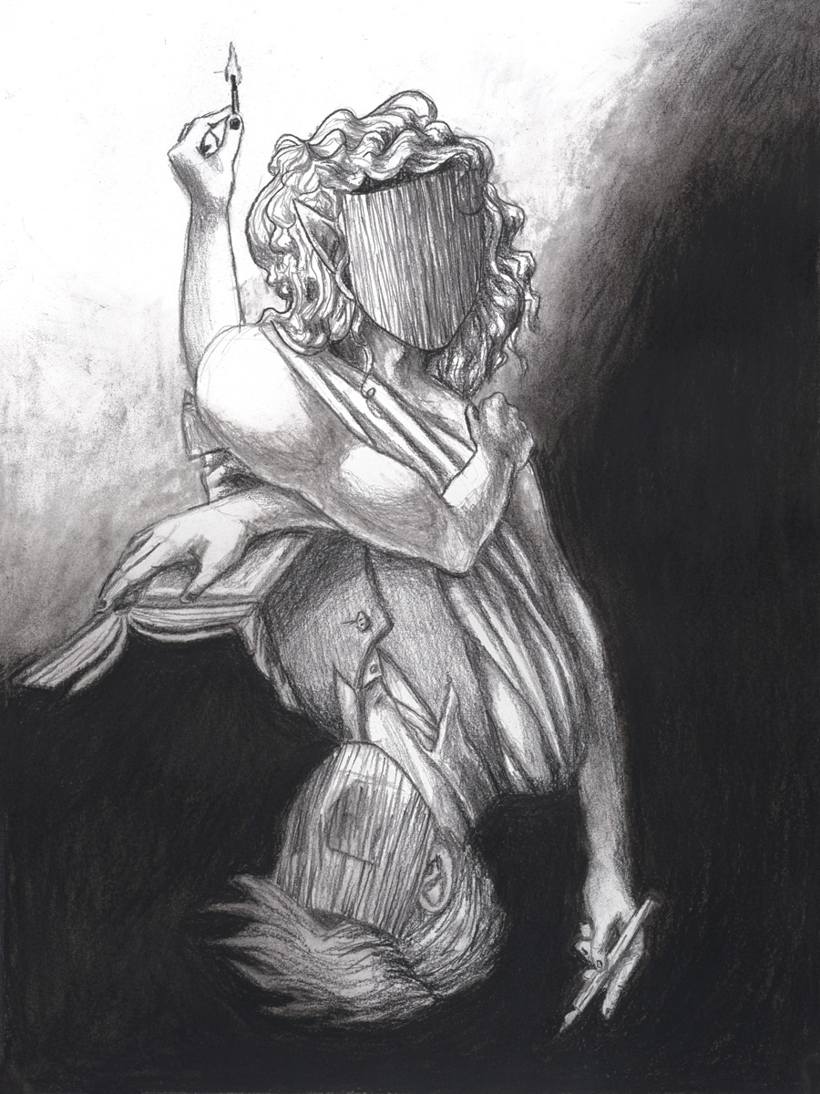The other face is still there, though. In-between momentary flashes of the other is a smooth, flat mask framed in waves of longer hair and a glimpse of pointed ears set in a dancing halo from the match stick. Their muscular shoulders are wrapped in gathered fabric and, in their left hand they hold a fountain pen with a sharp tip. If this particular figure could speak, you get the feeling it would mainly be in requests, but not quite straightforward.