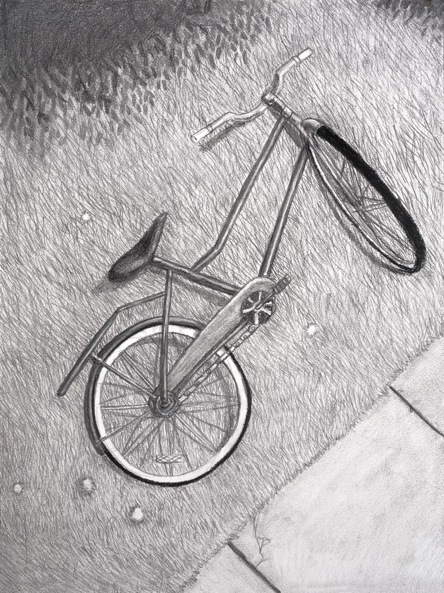 The golden hour washes over the sidewalk as you make your way back home. You pass an empty corner. The bicycle rises into view as you turn to climb the slight incline to the back-road shortcut further ahead. But you hesitate, and look again. It’s shiny and new, but not a person in sight. No bags, no stickers, no trail behind it.