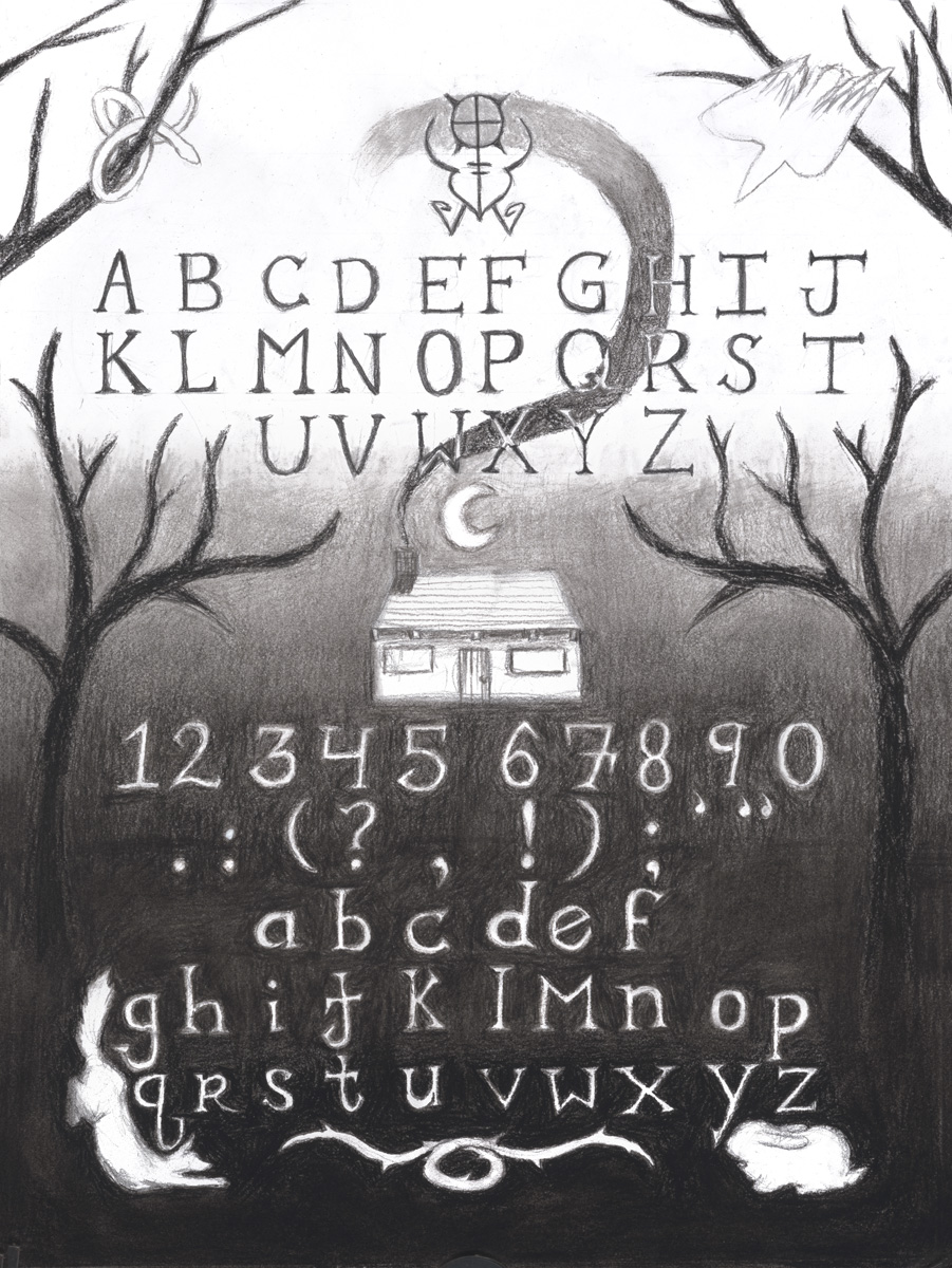– words scrawled in charcoal on the walls of an abandoned(?) house in the forest