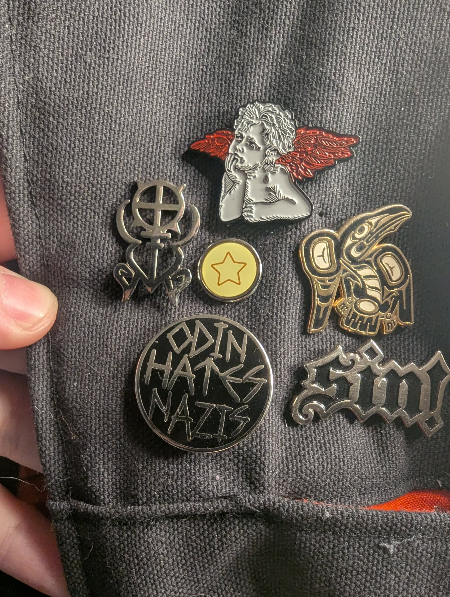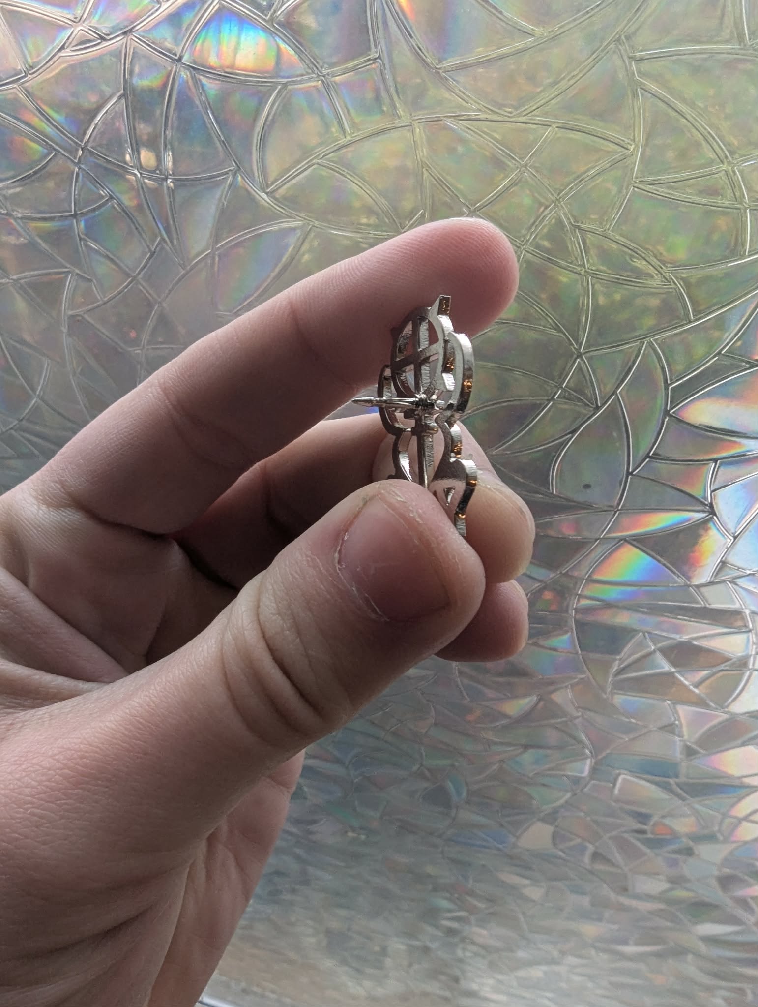 A silver-toned lapel pin shaped like The Liminal Sigil.